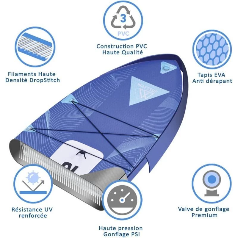 La marque Wattsup signe la fin des planches « entrée de gamme » en 10cm d’épaisseur en offrant aux riders des Stand up paddle accessibles et qualitatifs. A la fois plus stables, plus rigides et plus durables, les SUP Wattsup sont également dotés de 4 D-rings pour y placer un siège kayak et d’un kick pad pour gagner en manœuvrabilité.